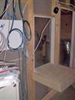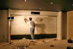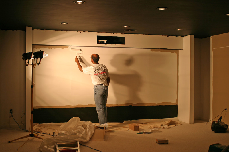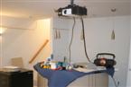Gee, where to begin. I guess I'll start with the house. Some other family speced the house out, then their deal fell through. By the time we took over the contract the house was already sheetrocked. The lot backs to open space; woods in this case. The original buyers chose not to put windows facing them. We had a 17' x 22' cave. Why not make a theater there? It's already light controlled. I started off with CADD plans; I'm an old-school CADD tech (I started using AutoCAD in 1987, version 2.16, for those interested.) and I had scanned floor plans of my house. I imported them into Map 2006 and rubber-sheeted them to roughly match the dimensions listed. As you all know, the Internet was a great source of information about building a home theater. Too much information, sometimes. Initially I wanted a plasma screen downstairs. At the time (2002 or so), 50" was as big as they came. 16 grand, IIRC. Gramophone was the local store I was visiting regularly, and as a HT shop they have many viewing rooms set up. One in particular was styled like what I wanted. I asked my wife to come by, as I wanted her comfortable with what I wanted to do. She insisted I wanted to show her hardware, which honestly wasn't the case. Anyway, she liked the room, but asked what kind of display device I had in mind. I showed her a couple of plasmas. She went back to the room I liked, which had a projector, and asked why I wasn't getting one of those. Good question. Once I decided on a projector, I had many more questions; What type (CRT, LCOS, DLP) What size screen? What brand? Most importantly, what price? By this time we had already completed the deck, over budget, so compromises needed to be made. More importantly, I had no idea how much a "good" projector costs. The guys at Gramophone gave me lots of model numbers, but no help in telling me what the differences between them were. The contractor had started phase two, and I needed to tell him where everything had to go. To make a long story short, before I learned enough to be an educated consumer Gramophone had a fall clearance. A Runco CL-700 demo unit was on sale for $4000, down from the MSRP of $9,995. I bought it, un-demoed as it was in the Timonium store, and I was in Columbia. Now I had screen questions to answer. I got the projector home, set it up on the bar and aimed it at the far wall. It looked pretty cool just on the wall (builder's paint, and a few crayola designs, courtesy of my two kids.) Being a guy, I made the picture as big a possible; in this case about 120" diagonal. My wife thought it was too big. I did some more research online and found out she was right (as usual). Based on my room size and the fact that the bar was already against the rear wall my seating location was about 10' from the screen. The general rule is you want the seating no closer that 1.5 x screen width. Working backwards I ended up with a 90" diagonal screen. I rounded up to 92" because the math works out better; that's 80" wide by 45" tall, in a 16:9 aspect ratio. I tried to figure out the throw distance mathematically, but wound up just placing my projector on a ladder (and a bunch of books) and moving it until I got the 92" screen to be in the middle of my zoom range. I also bought a ceiling mount from Gramophone (non-Runco). It used a piece of common pipe for the downrod. I painted it with Rustoleum texture paint to match the projector. As far as the screen, Gramophone quoted me on a $2,000 Stewart Screen-Tek. (90", coincidentally). As money was tight anyway I did some more research and found Screen Goo. For $200 I got a complete kit; primer, paint, roller, black border paint, and a foam brush. It works great, looks great, and saved me $1,800. I went with CRT white, as opposed to gray, based on the fact that my projector is a first-generation HD DLP, and not as bright as the newer models. The rest of the equipment was easy; I already had the A/V Receiver; a Denon AVR-5700. This is an older model, but it has built-in Dolby Digital RF decoding for Laserdiscs. I also had a Pioneer CLD-703 Laserdisc player with the Precision Laserdisc AC-3 output mod. For speakers I always wanted Polks, and the local Circuit City had a special on in-wall units which I was considering for upstairs as well. I got four RC-65i's and two RC-55i's for the rear surrounds upstairs. The deal was a free subwoofer with a $400 purchase, which I qualified for. Since the surrounds I was buying were the same price I got them for free. Tweeter was having a similar deal I demoed some RTi-6's, and liked them. I got a PWS-10 sub gratis with my towers. I wasn't planning on using a subwoofer upstairs, but for free... I liked the reviews of the CSi series center channels so I got a CSi-3 for upstairs, a CSi-5 for downstairs, and a PWS-505 for the basement as well. I ordered these from J&R. I got one more PWS-10. I tried to work a deal, but they wouldn't budge. I sold it for $50. After the holes for the surround speakers were cut, it was apparent that the right one wouldn't fit flush with the wall because the wall was too shallow. (The Ryland plans called for the studs to be laid flat against the foundation.) Dimitri was originally going to extend a wall to make up the depth, but when his son Dino cut the drywall he test fit the speaker. He had a brilliant idea; chipping away the foundation with a hammer to clear the woofer was all that was needed to make the speaker fit flush. That saved a lot of time and money. I decided to go with a 5.1 setup initially. Since the rear wall adjoins the unfinished area I could cut speaker holes and run speaker wire at any time. Also, my A/V receiver is only 5.1. Finally, I don't own any 7.1 (or even 6.1) movies. I'm sure when HD establishes itself that will change. From the internet I found out I didn't have to spend a lot on speaker wire, and I learned how to run a subwoofer cable using RG6 I already had. All I had to do was buy some additional tools, which I didn't mind. Phone an
